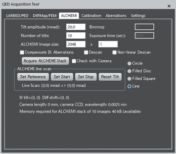 Therefore, we developed a QED-based ALCHEMI mode, where a DM script is executed to acquire a spectrum for each beam direction instead of taking a diffraction pattern using a camera. Thus, the ALCHEMI mode of QED makes possible to analyze dopant distribution at a nanometer scale. In addition, the QED_Class has been added to open the beam tilt capability of the QED.  Using this class, the beam can be easily tilted from a DM script compensating the illumination aberrations.